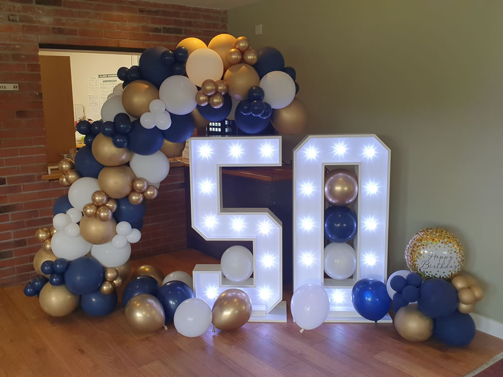 Mainly used for birthday celebrations and the odd company milestone celebration. Our classic half-balloon arch and 2x light up number combination is simple yet effective and is perfect for most small scale events.
