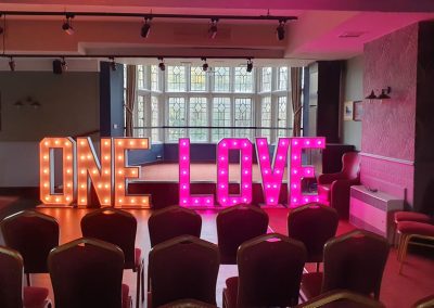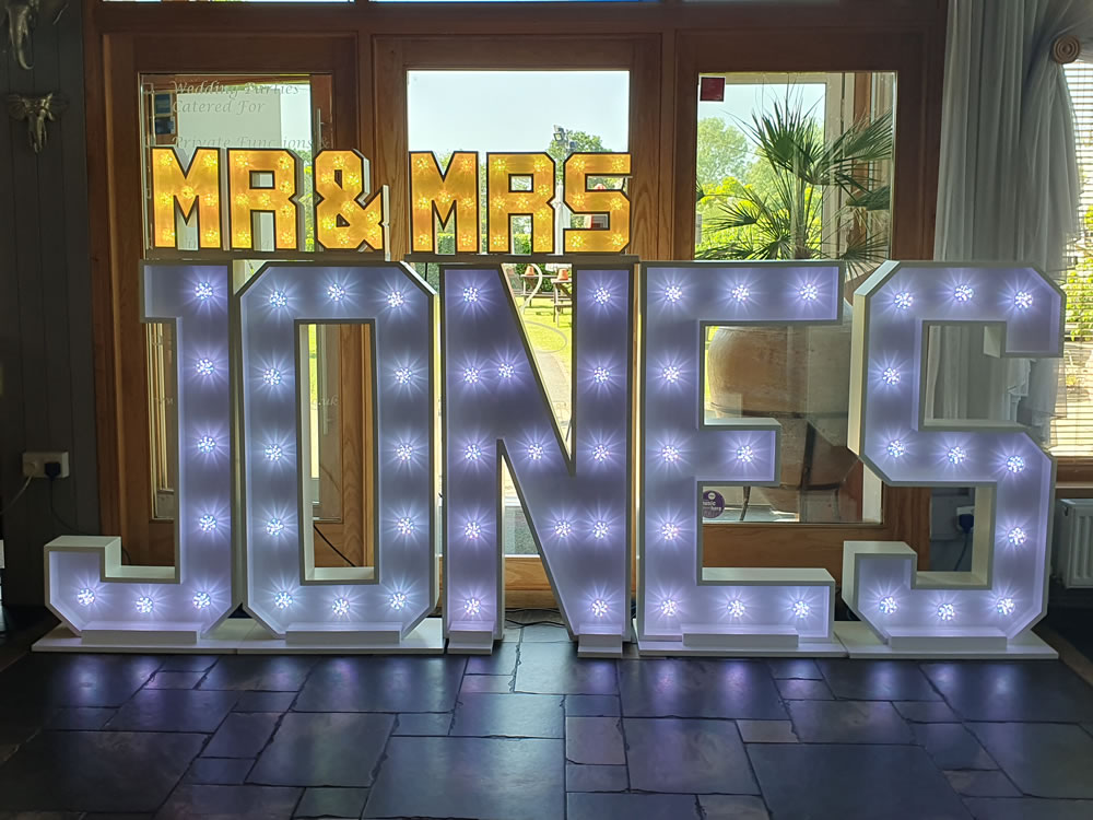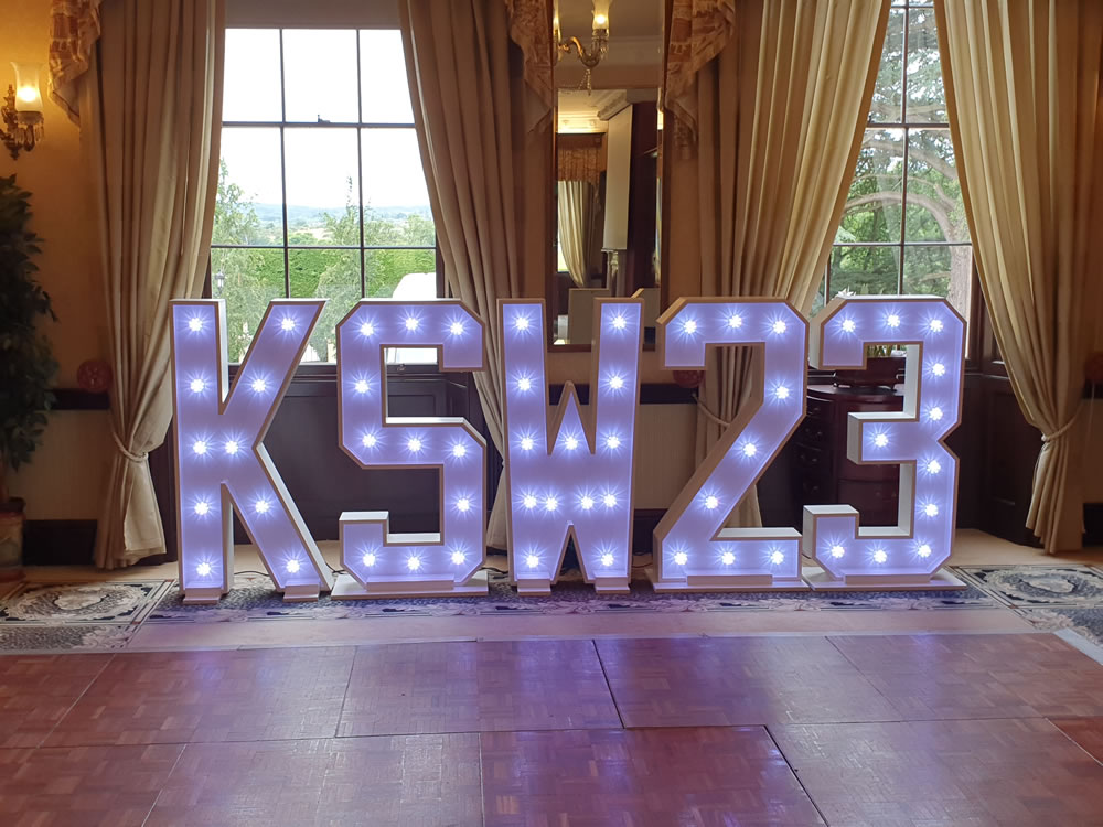 We have 2x full alphabets and 3x sets of light up numbers, so can spell pretty much anything you need, and any letter/number combinations you may require.