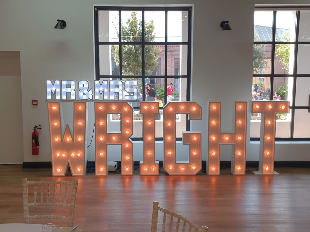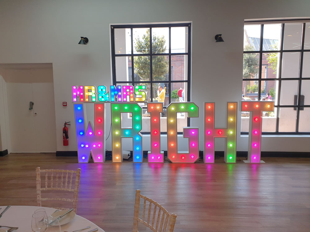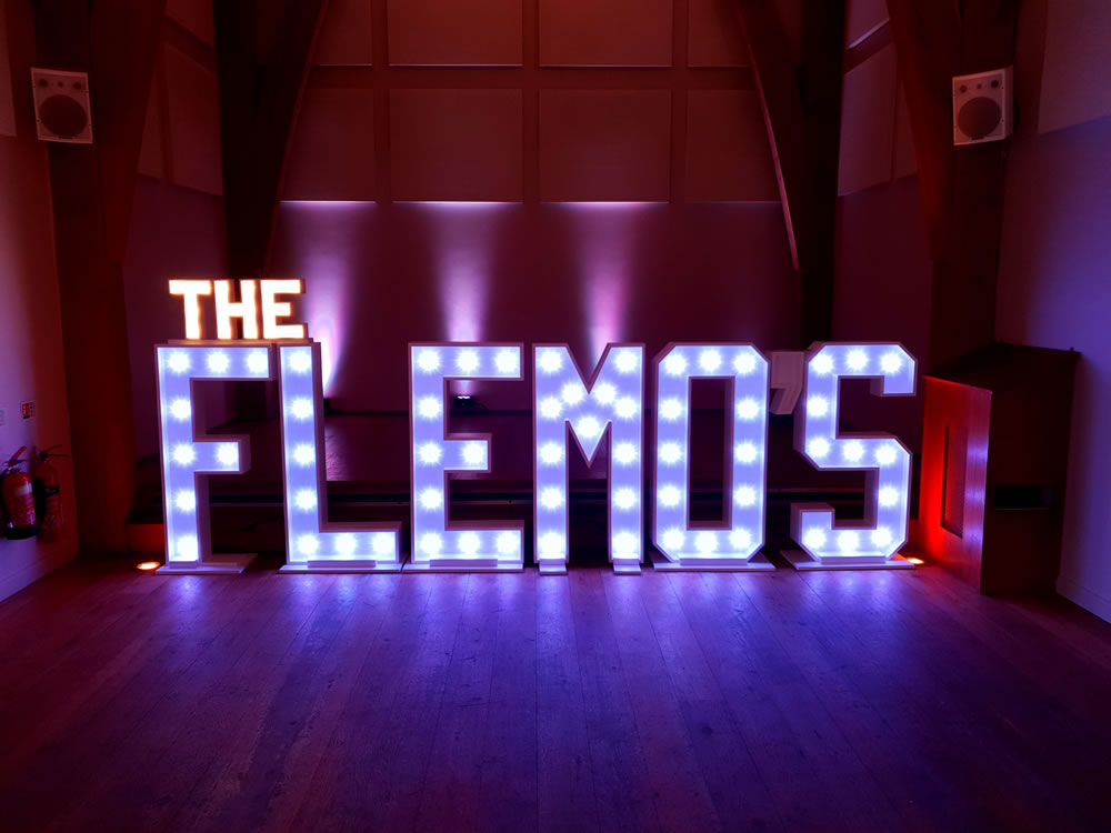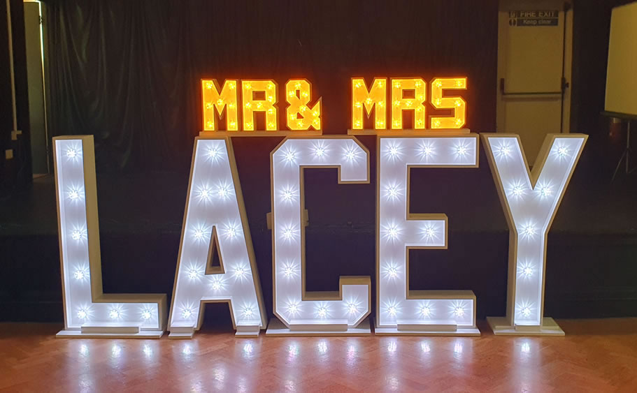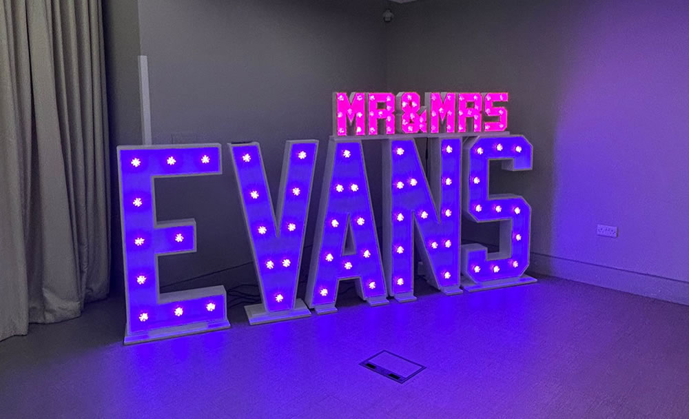 As stated we have 2 full alphabets and can spell pretty much any name you want. We also have speciality lights called “toppers” which are minature light versions, that sit on top of our 4ft letters and allow us to spell things like MR&MRS SMITH or THE FLEMO’S like below. Our speciality lights are just £50 each to hire. And again like all of our light u letters & numbers, you are not restricted to pure white lights. Depending on how bold you are, you can set the colour of the lights to suit you.
