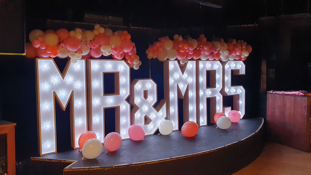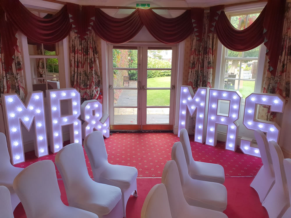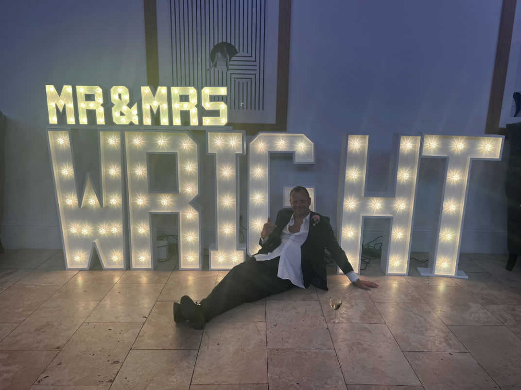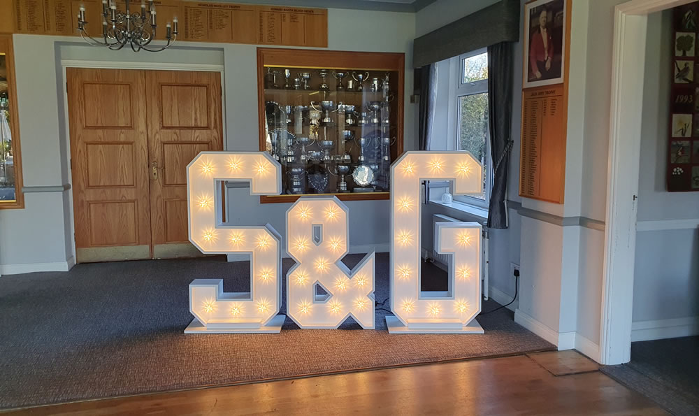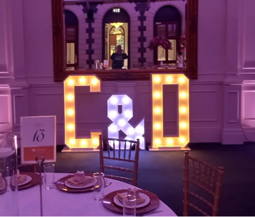 As stated we have 2 full alphabets and can spell pretty much any name you want. We also have speciality lights called “toppers” which are minature light versions, that sit on top of our 4ft letters and allow us to spell things like MR&MRS SMITH or THE FLEMO’S like below. Our speciality lights are just £50 each to hire. And again like all of our light u letters & numbers, you are not restricted to pure white lights. Depending on how bold you are, you can set the colour of the lights to suit you.