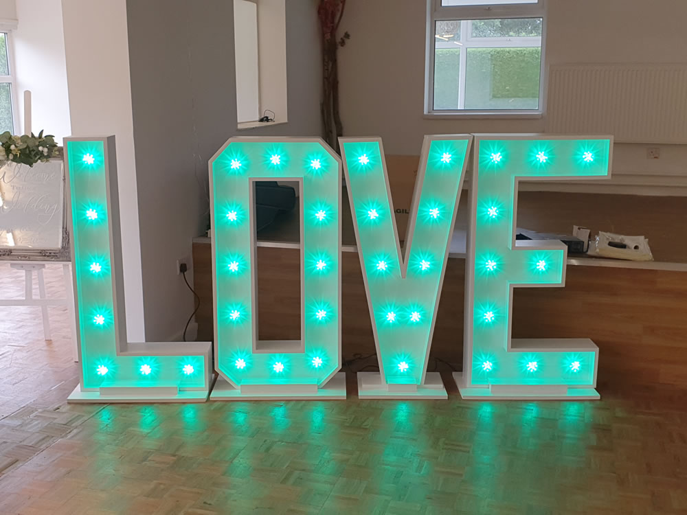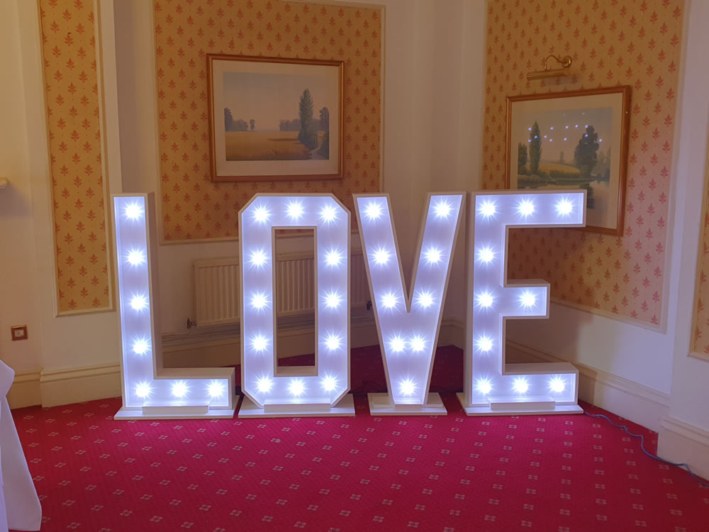 Made from solid 18mm MDF and painted in a beautiful white finish. Our wedding letters are 4ft tall by approx 2ft wide and make the perfect visual display for your wedding day. We have the traditional LOVE or large MR&MRS lights as well as 2x full alphabets, allowing us to spell pretty much anything you would like.